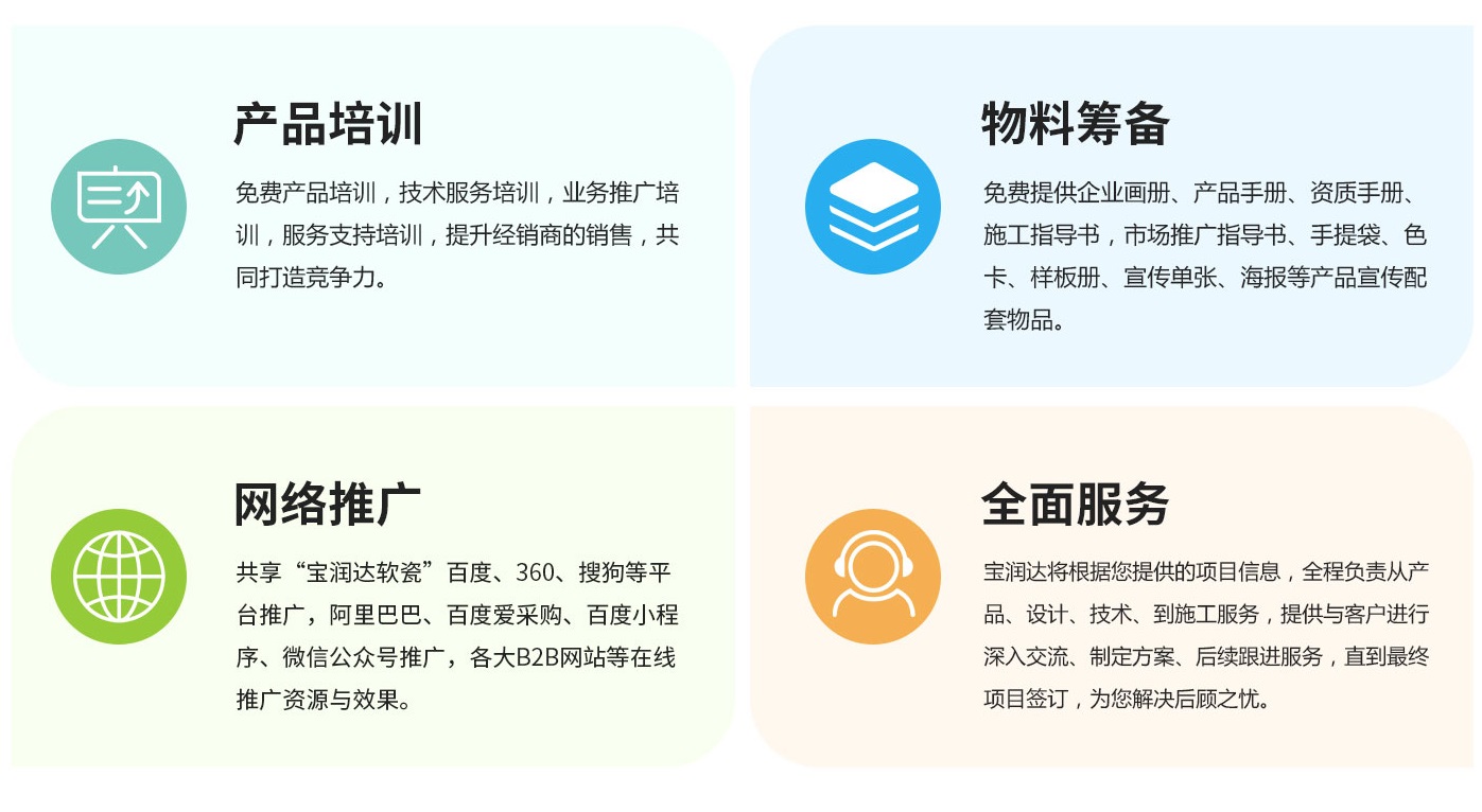 2、完備的服務系統:系統的售前、售中、售后服務,專業的軟瓷營銷策略及施工技術