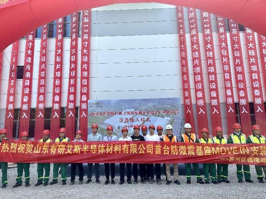 良辰吉日,開工大吉! 2023年6月12日,上午10時許,山東有研艾斯半導(dǎo)體材料有限公司在德州現(xiàn)代化新廠房舉行了山東有研艾斯半導(dǎo)體材料有限公司首臺防震基座MOVEIN安裝與設(shè)備搬入及啟用儀式,正式啟動!蘇州佳捷集團公司蘇州佳捷搬運公司工程總監(jiān)陳漢鳴先生、蘇州佳德捷減震科技有限公司工程部經(jīng)理彭志剛先生與客服部唐媛媛等人出席山東有研艾斯半導(dǎo)體材料有限公司首臺防震基座MOVEIN安裝與設(shè)備搬入及啟用典禮。